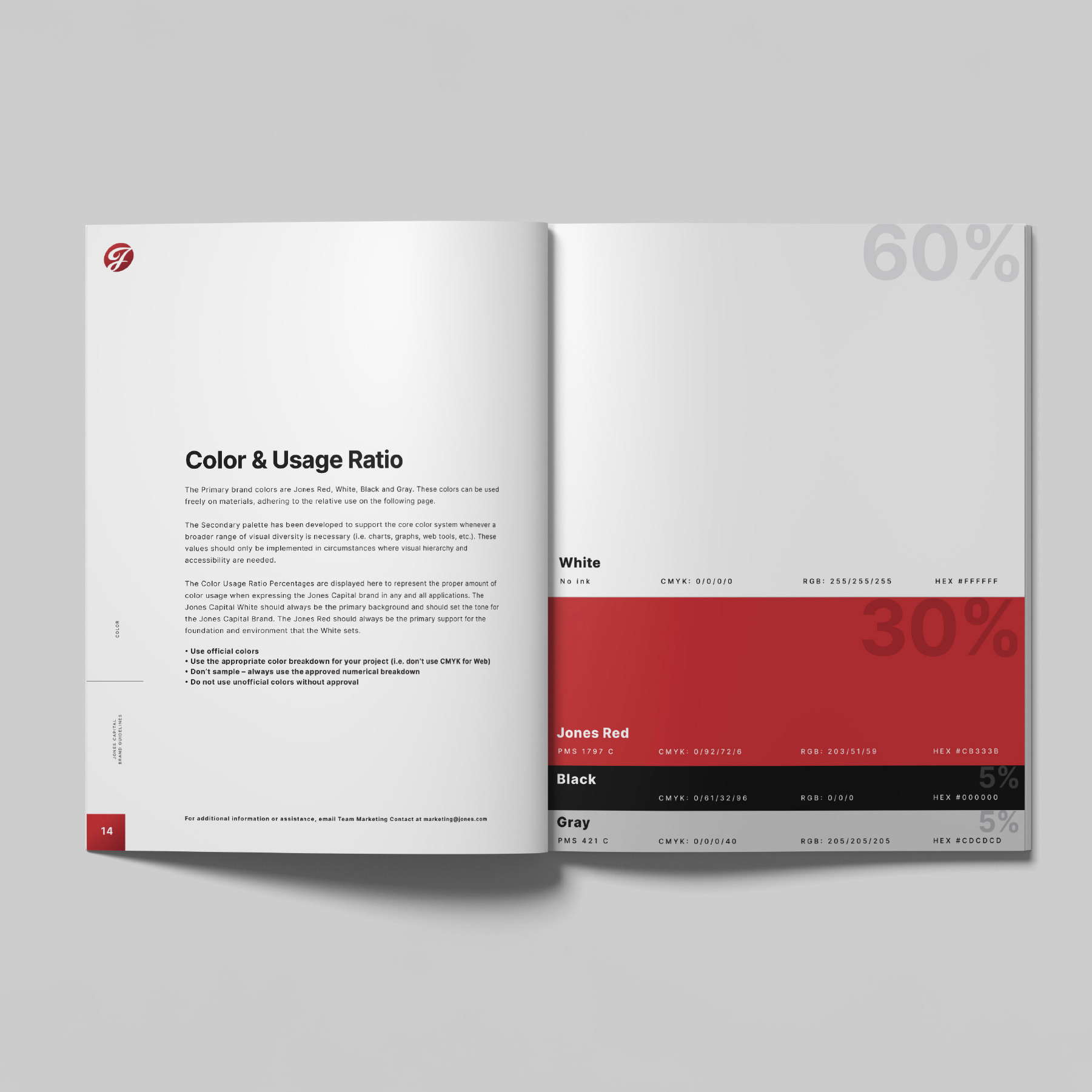 To ensure lasting consistency, I developed a comprehensive set of brand guidelines. These guidelines detailed everything from philosophy and brand voice to exact visual standards for print, digital, and environmental applications. The goal was to provide the Jones Capital team with a system that could scale across platforms and empower them to tell their story cohesively as they continue to grow.
