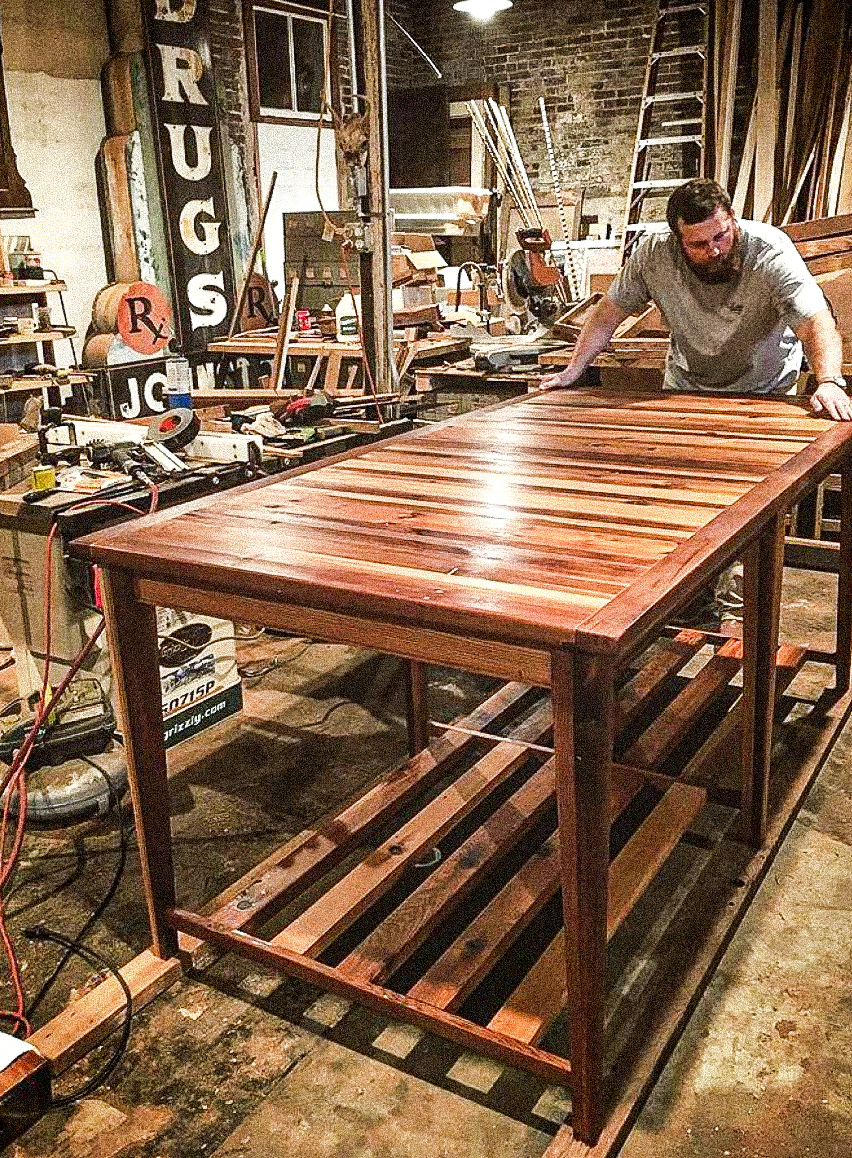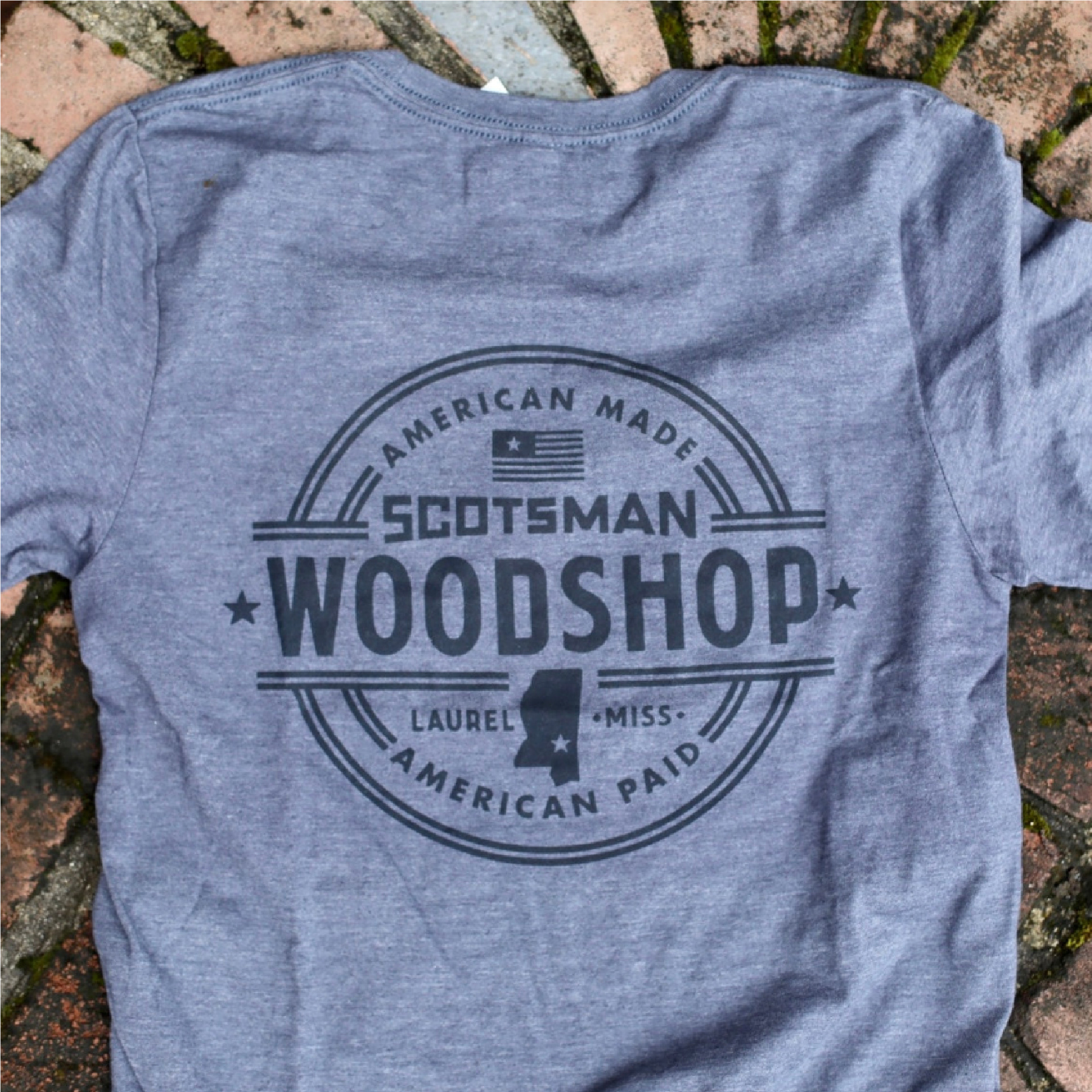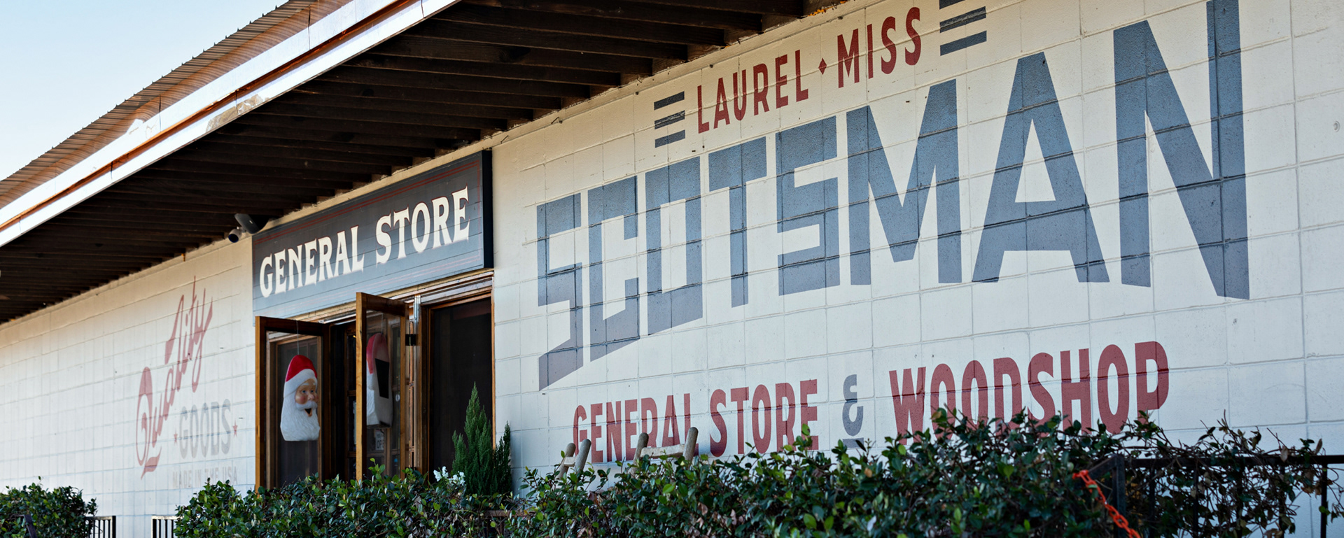 Before Ben had his full-scale Scotsman Woodshop built on Spec Wilson Blvd., he started out his woodworking career in the basement of a 100 year old building in the heart of downtown Laurel. Formerly known as the “Johnston Drugs Building”, this pharmacy provided prescriptions of all kinds for the early residents of The City Beautiful. The original hand-fabricated metal sign that advertised the pharmacy provided a backdrop for Ben in the early years of Scotsman Co.